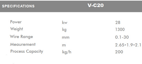 V-C20 wire shredder machine is mainly used for the disposal of waste electrical wires, such as automobile circuits, electric scooters, and televisions, washing machines, refrigerators, air conditioners, communication facilities, and computer wires. This is an effective and useful device.