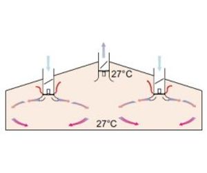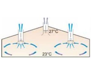 At low ventilation rates (when it is very cold outside and/or when the birds are small), the CoronaD preheats the air by mixing a minor quantity of cold incoming air with warm room air, before distributing this preheated air evenly throughout the building.