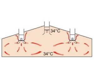 During the growth period - and depending on the outside climatic conditions - the mixing of air is automatically changed always adding the exact amount of air that is needed to maintain the optimum climate in the building. To this the constant circulation of heated air among the animals keeps the litter dry and removes CO2 and other gaseous waste products. The breeze of tempered oxygen rich air effectively removes pollutants, keeps the litter dry and allow the birds to exploit their full genetic potential.