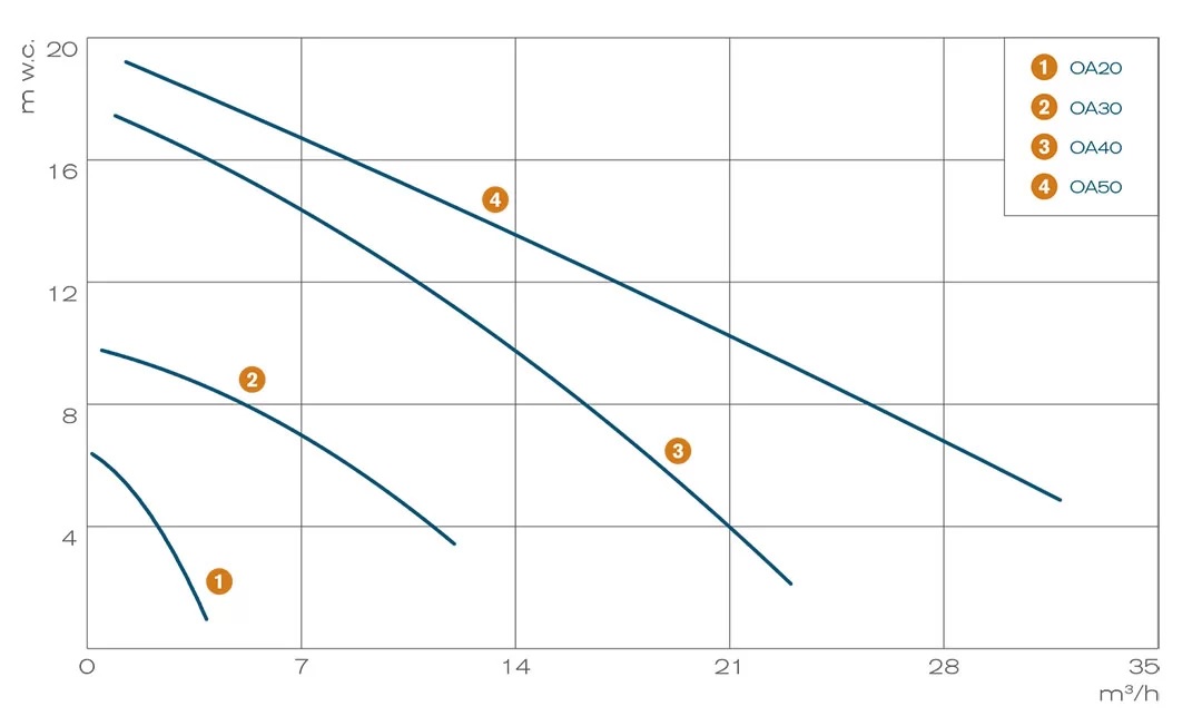 - Maximum head: 20 m w.c.