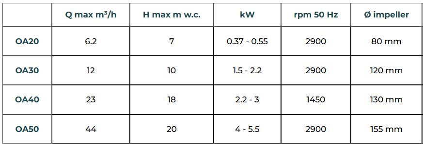 OA Series horizontal pumps. With anti-clogging impellers and large internal spaces, they can pump even very dirty industrial liquids (containing solid fibres and other coarse impurities). Max flow rate 32 m³/h. Max head 20 m w.c. Plastic construction materials: PP, PVC, PVDF. Corrosion-resistant plastic pumps. With mechanical seal and non-clogging impellers, ideal for pumping aggressive liquids or even very dirty industrial fluids (coarse solids, fibres, filaments, etc.).