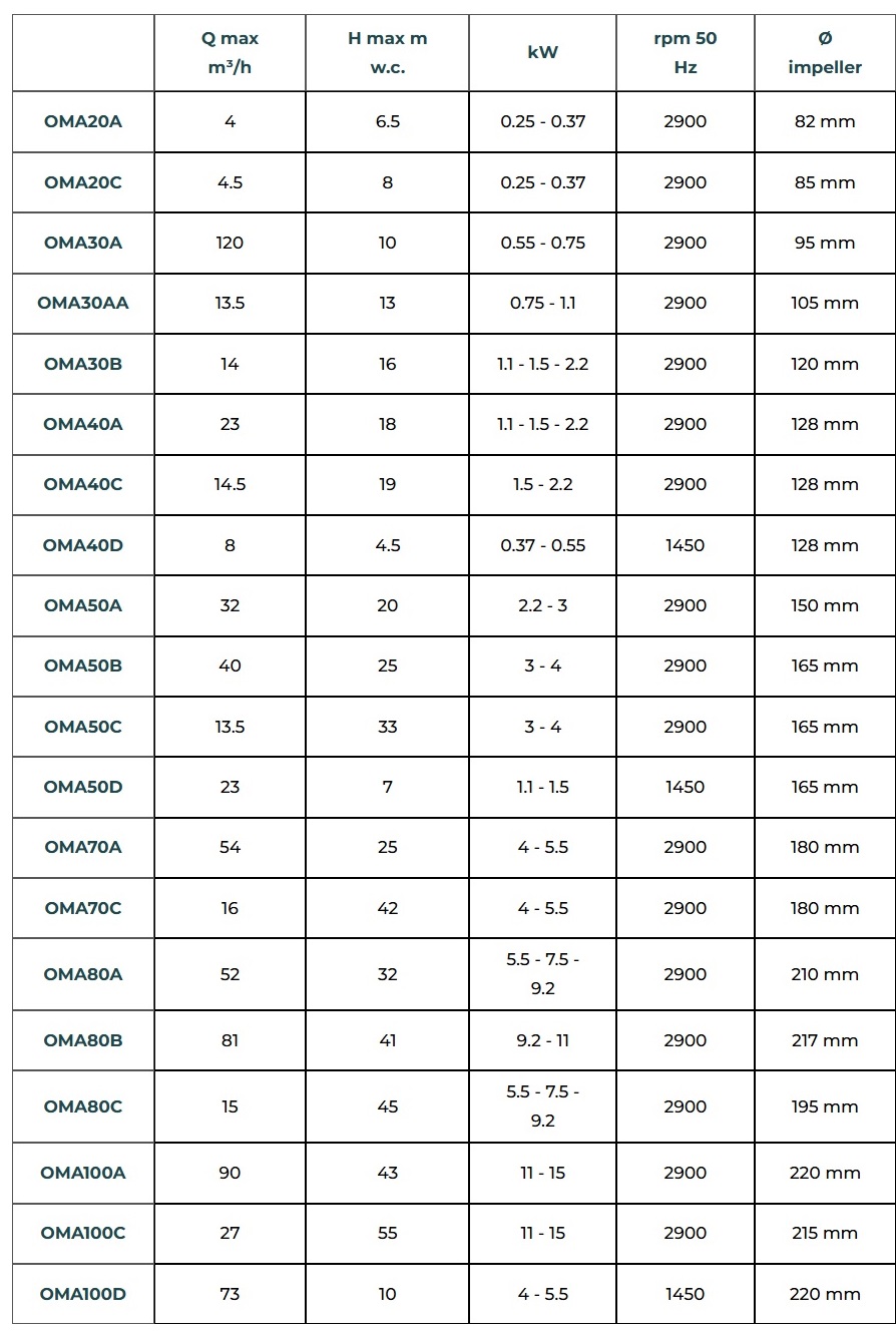OMA Series close-coupled horizontal pumps. With their compact design, these pumps are compatible with numerous corrosive products used in industrial processes and chemical plants. Max flow rate 90 m³/h. Max head 55 m w.c. Plastic construction materials: PP, PVC, PVDF. Corrosion-resistant plastic centrifugal pumps. With mechanical seal. Suitable for pumping aggressive liquids, industrial fluids (including charged fluids), chemicals, processing waters and acid solutions.