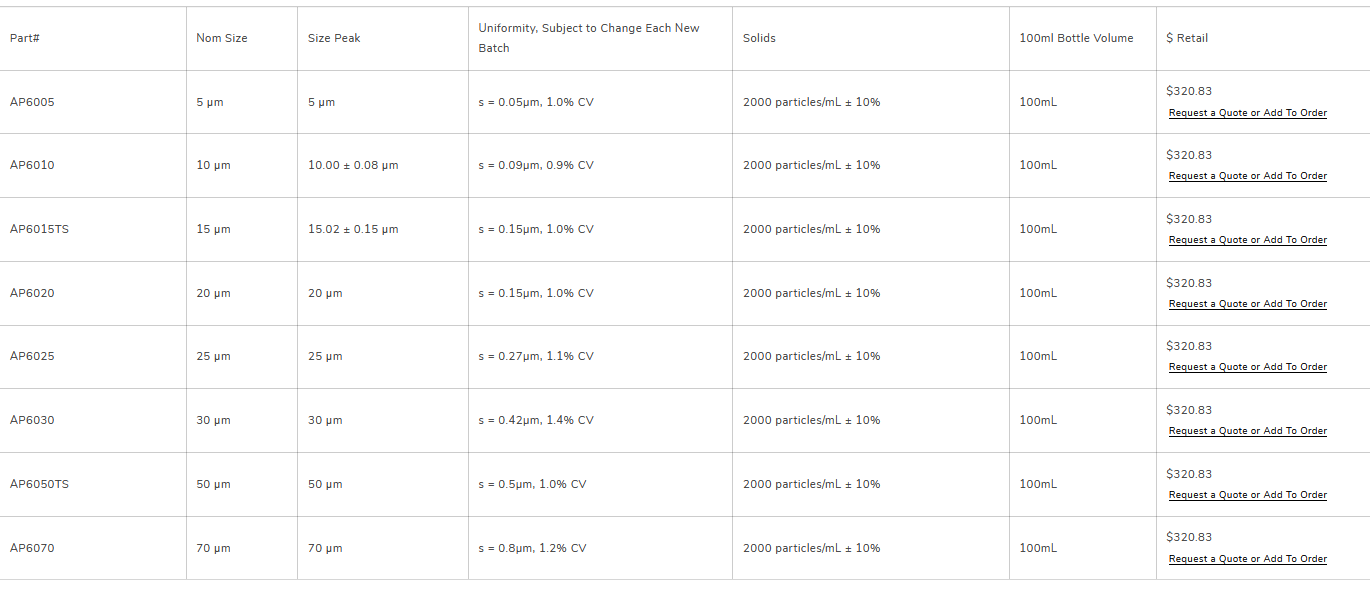 - Ready-to-use (no dilution required) particle size standard for validating optical particle counters