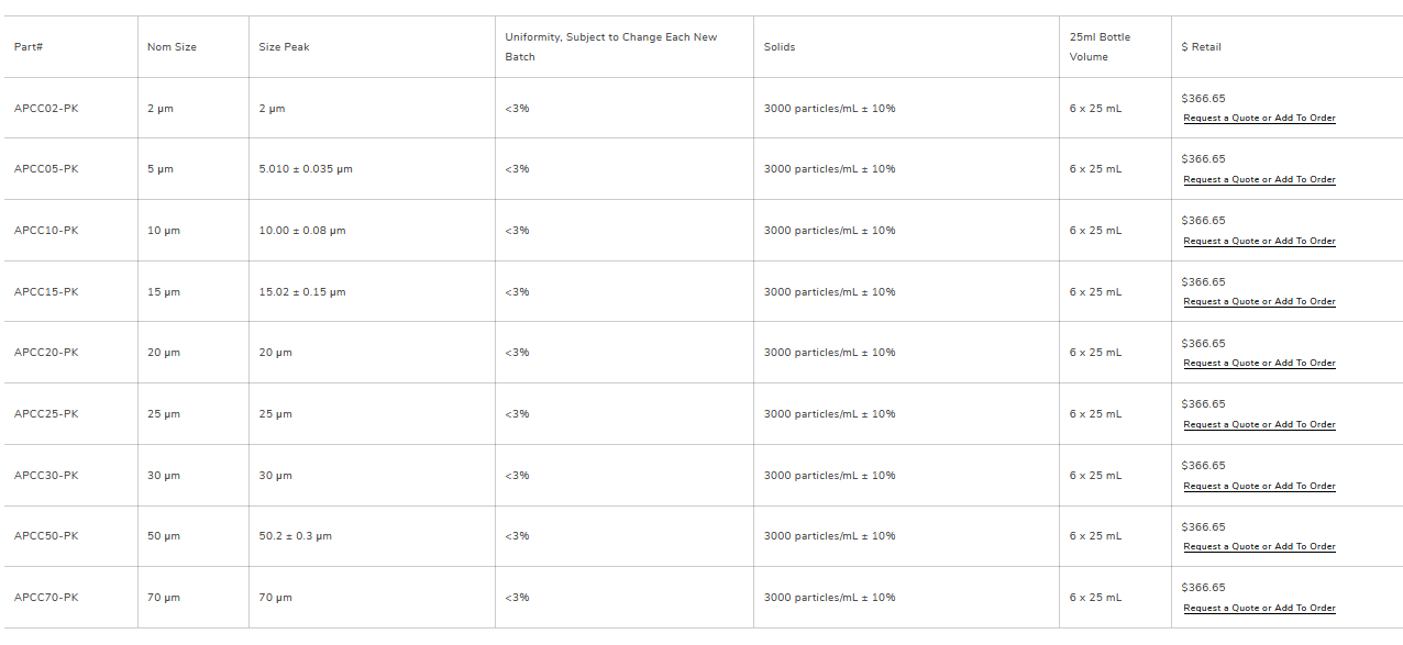 Ready-to-use precision size standards are designed for regular use in liquid particle counters to verify instrument calibration before each use, assuring the reproducibility of the particle counter by permitting a continuous record of its performance using a NIST™ traceable microsphere suspension with a precise concentration.