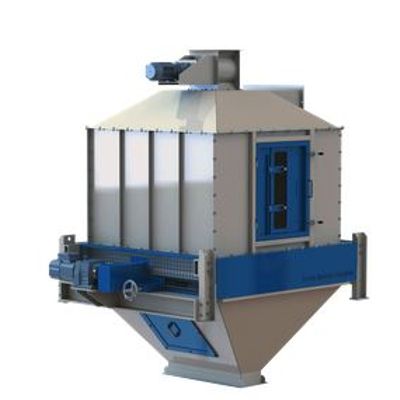 Counterflow cooler with minimal space and an effective moisture control. The cooler reduces the excess moisture, but above all it allows to lower the rising of the temperature following the pelleting process. The advantage of our cooler is that you only need a small space to equip it. It will be effective in controlling humidity and acting on temperature without affecting the product.