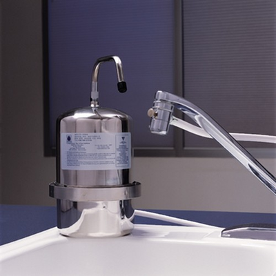 The standard countertop installation kit includes a dual-hose diverter valve and an acrylic base that allows the system to sit on top of the counter next to the sink. The system connects to the sink faucet with the dual-hose diverter valve, outputting filtered water from a spigot on the diverter valve itself. Filtered or unfiltered water can be selected by a push-button on the diverter valve.