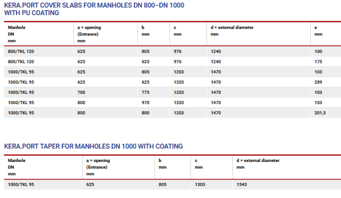 For sizes DN 800 to DN 1000, concrete cover slabs are produced. These are reinforced to the requirements of traffic load D 400. Up to DN 1000, the cover slabs are finished with corresponding recesses on the underside to secure them against displacement.