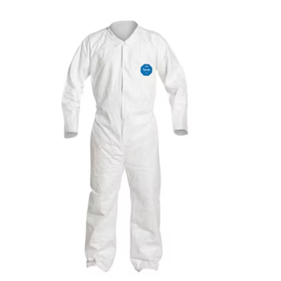 DuPont Tyvek 400 Coverall. Comfort Fit Design. Collar. Snap Front,Open Wrists and Ankles. Elastic Waist. Serged Seams. White.