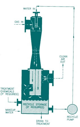 In most instances HCl is scrubbed either with a Jet Venturi Fume Scrubber (typically achieving 95% removal efficiency in a single stage), or with a Counter Current Packed Tower (able to achieve efficiencies exceeding 99.9% removal). If a gas stream contains high concentrations of HCl, a Jet Venturi Fume Scrubber may be followed by a Packed Tower. The Jet Venturi removes the bulk of the HCl and the Packed Tower. Systems using recycled water, concentrating acid to 10 wt%, have been supplied to clients that have on-site use for dilute acid by products.