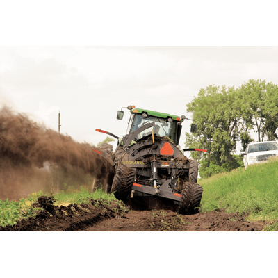 The Revolution Ditcher, produced by Crary Industries, establishes itself as a pivotal tool for the creation and maintenance of waterways, ditches, and terraces. This equipment is essential for efficient water management, significantly contributing to enhanced agricultural yields and profits. Featuring a 5-foot flat bottom, the Revolution Ditcher ensures a smooth terrain that facilitates easy navigation by farm machinery. It is especially advantageous for dealing with varying field conditions, offering versatility by throwing dirt in both directions. Key technical attributes include a patented cross auger design for effective dirt distribution, a planetary gearbox for powerful performance, and a 6.5-foot diameter rotor designed to handle rocky conditions with high throughput. Enhanced with auto-level and hydraulic controls, along with bolted wear parts for easy maintenance, the Revolution Ditcher is built for durability and efficiency in diverse soil types. Standard features, such as large flotation tires, reduce soil compaction, making it an invaluable asset in modern agriculture.