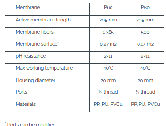 Cross flow, 4 port housed hollow fiber membrane module. Glued PVCu housing.