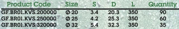 Product Code : GF.BR01.KVS.200000. Size : 0 20. S : 3.4. D :20.3. L : 350. Quantity : 90.