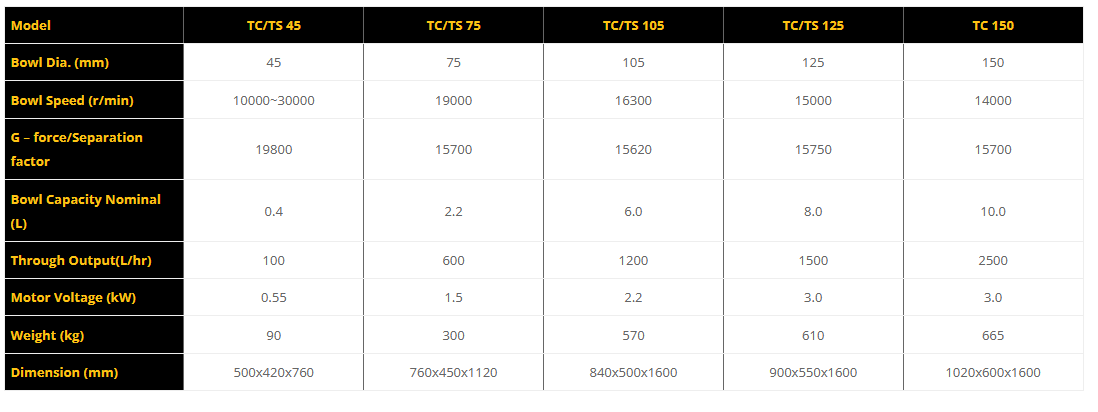 TS/TC-45 Tubular Separator is mainly used for the Laboratory or small scale industry application, by the adjustable high rotating speed from 8000-30000 rpm, it can almost used for every liquid separation for testing. It can achieve two functions with only one separator by exchanging the bowl.