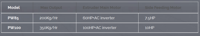 Crushing, extrusion and pelletizing three-in-one system can save space, reduce energy consumption, and lessen labor costs. Vent on the Barrel to evaporate the volatiles from the Recycle Material. Die Face water-cooling for easy operation. Conveyor material loader provides a safe working environment. The Vertical Centrifuges separate and dry the Pellets faster. Pressure gauge meter display to maintain good production and operator safety.