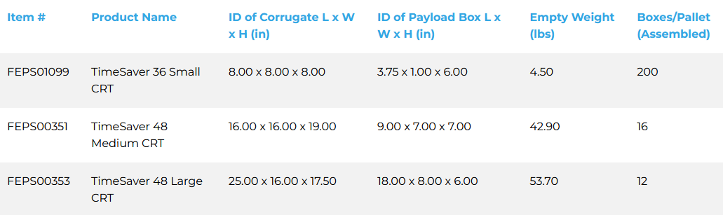 The TimeSaver CRT solutions protect products that must be shipped within a controlled room temperature (15-30°C temperature range) for up to 24 or 48 hours. The components listed below are included with each system.