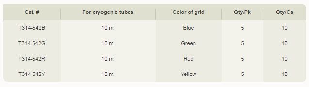 Made of extra strong polycarbonate, these durable cryogenic storage boxes are designed to be used at temperatures between -196 °C and +121 °C and are autoclavable at 120 °C, 15 psig (1 bar) for 20 minutes. Different colors are available to accommodate 42 x T310-10A cryogenic tubes. A transparent cover allows the user to see the contents of the box, and is keyed to the base to prevent misalignment. Printed with a series of squares numbered from 1 to 42, the surface accepts writing with markers, facilitating inventory control.A unique color coding system uses colored plastic grids to separate the cover from the base on the box. A choice of four popular colors is available. Series 542: Size: 133 mm x 13 mm x 95 mm H ( 5 1/4 x 5 1/4 x 3 3/4 in. H).
