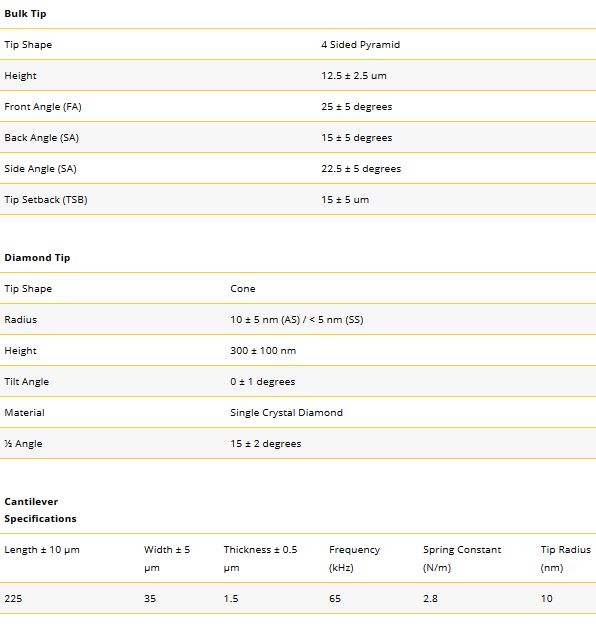 Highly conductive diamond probes, formed by a unique patented process ensure the best possible wear and electrical performance. These tips are sharper and last longer than any other electrical AFM probe.