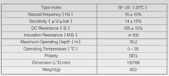 SF Series Hydrophone is a hydrophone used for submersible seismic exploration, it is a new type of hydrophone which is designed and supported by the latest international technology. It features compact design, high sensitivity and excellent seal ability. The working depth ranges from 1m to 75m and can be interchanged with LS-2512, MP25, P350 and P-44A etc.