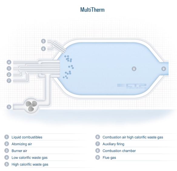 For safe removal of highly contaminated, i.e. halogenous, waste gas streams and liquid waste as well as wastewaters, especially in the pharmaceutical, chemical and petrochemical industry. CTP‘s MultiTherm is a combined process. It consists essentially of a thermal oxidation and one or more upstream or downstream processes fitted to the application. These could be heat recovery, wet scrubbing and DeNOx, among others. Our burner system has managed the simultaneous combustion of many highly variable waste streams.