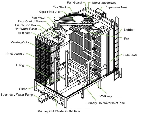 When the cooling tower is in operation, the cooling water is susceptible to environment pollution. Closed circuit cooling towers are used to avoid the generating of deposits and scales because of the direct contact between the cooled fluid and air. This will avoid clogging and corroding problems. This closed circuit cross flow tower is required in those areas with poor water quality or when the cooled fluid or equipment will tolerate no pollution at all.