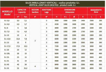 We produce bolted silos basically because they can be loaded in large quantities into lorries or containers and this can obviously reduce the transport costs. S.I. silos have an upright seam and they are very easy to assemble. Apart from that, they have the same features and offer the same advantages of the monolithic silos: They are light-weight and airtight. They offer high mechanical resistance and perfect thermal insulation. They do not require any special maintenance, they are corrosion-free and they are projected and made to last very long over time. CTS silos are equipped with: Transparent level inspection stripe, Hot-dip galvanized supports, Pneumatic loading pipe and Vent pipe, Inspection ladder with protection rings, Cover (different types and different opening system), fiberglass bottom for screw conveyor or sliding gate for manual discharge.