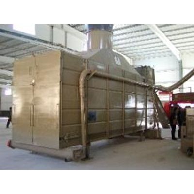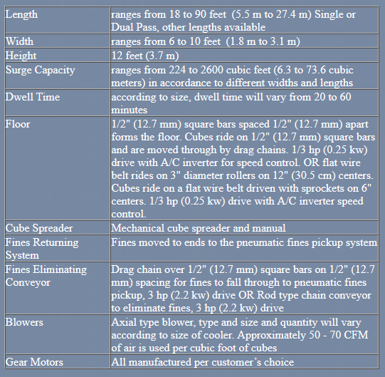 he Cube Cooler reduces time required in the cube curing process by removing the cube moisture and cooling cubes to ambient temperature. The cubes come directly from the takeaway conveyor into the Cube Cooler. The Cube Cooler spreader insures proper depth and an even distribution of cubes, assuring an even air flow. The cubes ride on either a drag chain or a wire belt or both, which reduces risks of cube damage and fines. The cubes will be discharged onto a fines eliminating conveyor for final fines elimination. Because of time reduction in cube curing, the clean cubes can go directly into a bagging system, container or storage.