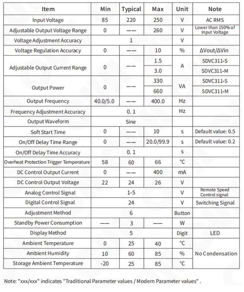 - The output frequency range is widened from 40.0Hz~400.0Hz to 5.0Hz~400.0Hz.