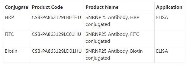The SNRNP25 Antibody (Product code: CSB-PA863129LA01HU) is Non-conjugated. For SNRNP25 Antibody with conjugates, please check the following table.