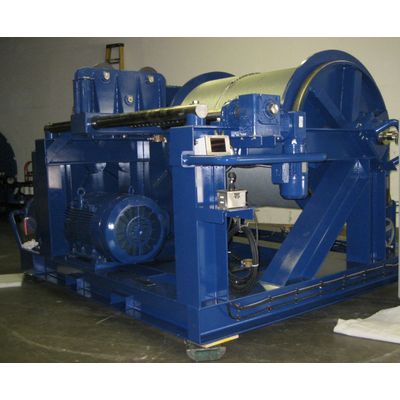 Custom-built Oceanographic winch with 200HP IP65 induction motor with independent level wind drive capable of pulling 27,500 line tension (12,500kg) at 147 ft/min (45m/min). Closed-loop motor control with dynamic braking provides ultra-slow payload control down to a few feet per minute. The drum holds 24,600 ft (7,500 m) of 0.680 in. (17.2mm) electromechanical, double-armor cable. Level wind incorporates load and magnet sensors for direct line tension and scope read-outs on a daylight-bright display. Hand-held pendant control allows adjustment of the level wind carriage position.