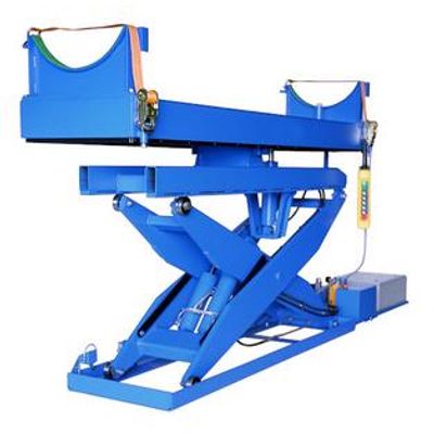 2 tonne lift table type EL20-160T30 with 30 degrees top frame tilt table for supporting a torpedo. It is used by the Swedish Navy and several NATO members as a simulator for the test of torpedo control systems. Lift table type E5-80T45 with tilting platform of 45 degrees around 1 long side. Note the reinforced baseframe.