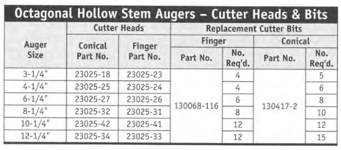 Cutter heads for Hollow Stem Augers are designed with replaceable-type carbide inserts. The cutter head design allows the center plug with the pilot bit to be positioned slightly ahead of the cutter head. A hollow bore drill head allows the center plug to be withdrawn to the surface when the desired depth of the hole is reached. Center stem rods are used to connect the center plug to the center stem adapter and adapter cap of the auger string at the surface.