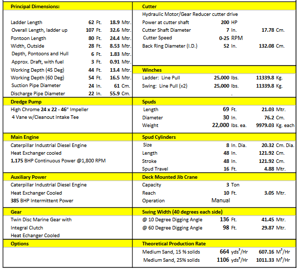 Powerful, fuel efficient, offering the lowest overall operating costs, Variable Speed, High Torque Cutter Drive System, Fresh Water Cooling System, Three major Hull sections for easy transportability and assembly, Broad range of optional equipment to customize to your work, Dedicated diesel generator for AC power.
