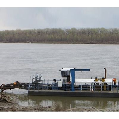 High-pressure hydraulic piston pumps and motors offer increased efficiency and extend hydraulic component life. The dual acting boom cylinders provide power up and down so additional force may be applied downward on the cutter head while digging. Our rack and pinion spud drive system provides power up and down allowing the ability to force the spuds down into the ground to better hold their position. Our free floating spud option allows the ability to place the spuds into free sliding mode for changing water levels while the dredge is not in use. Optional jib crane, lighting, generator, tail winch and different cutting edges are available. The pontoons are available cora-foam filled for floatation safety or with removable man-lids.