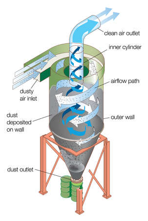The incoming dirty air enters the cyclone and spins quickly as it moves down and then back up the unit on its way to the exiting through the outlet. The centrifugal force generated by spinning the air and it changing directions repeatedly causing the larger dust particles to be flung outwards where they strike the side of the unit and then fall down towards the discharge. The most common style cyclone creates a dual vortex, a main downward vortex to disperse the coarser matter, and a secondary upward vortex to remove the finer particles on the return to the outlet to the duct system.