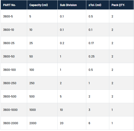 3600-AMBER GLASS, Measuring Cylinder Graduated, Hex Base, Class A, serialized, ASTM.