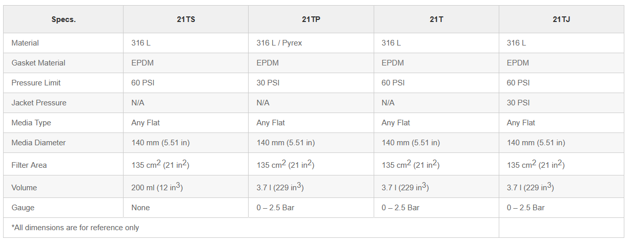 The 21T Series lab Laboratory Filters are for use in laboratories to perform filtration trials and scalability studies. These 21T Laboratory Filters are constructed of 316 stainless steel with stainless steel cylinders for pressures up to 60 PSIG, or a protected Pyrex® glass cylinder for filtration up to 30 PSIG. Stainless steel cylinders can be furnished with an optional heating or cooling jacket.