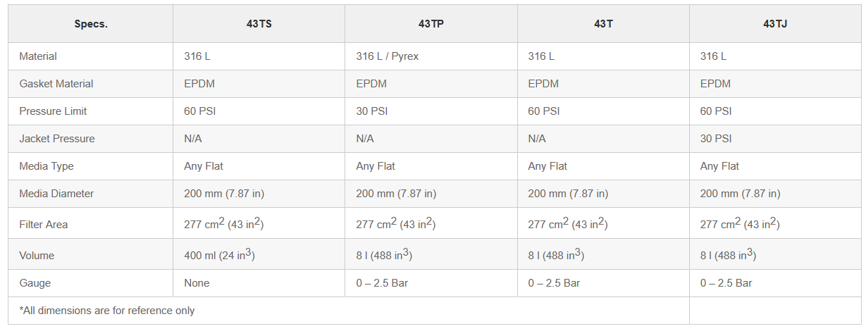 The 43T Series Laboratory Filters are for use in laboratories to perform filtration trials and scalability studies. These units are constructed of 316 stainless steel with stainless steel cylinders for pressures up to 60 PSIG, or a protected Pyrex® glass cylinder for filtration up to 30 PSIG. Stainless steel cylinders can be furnished with an optional heating or cooling jacket.