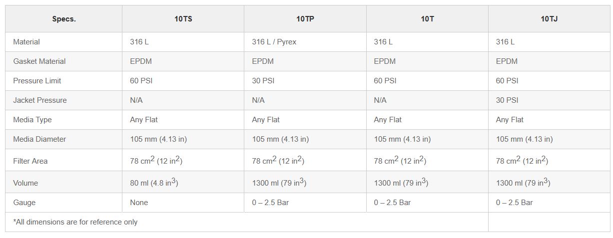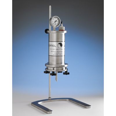 The 10T Series Laboratory Filters are for use in laboratories to perform filtration trials and scalability studies. These Laboratory Filters are constructed of 316 stainless steel with stainless steel cylinders for pressures up to 60 PSIG, or a protected Pyrex® glass cylinder for filtration up to 30 PSIG. Stainless steel cylinders can be furnished with an optional heating or cooling jacket.
