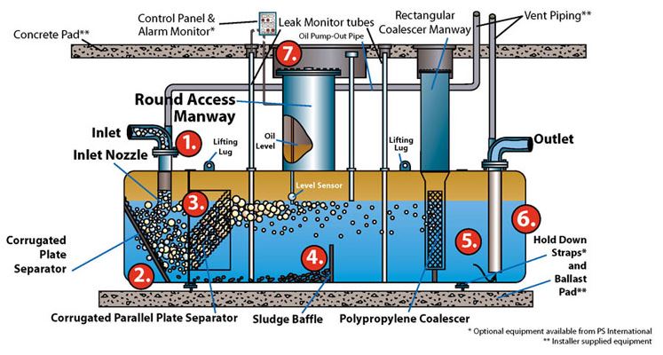 - The outlet pipe is located at the end of the separator and draws clean water from the most quiescent section of the vessel. The effluent will contain a free oil and grease discharge of no more than 15 ppm in PS and PSR model separators and no more than 10 ppm in PSC and PSRC model separators.