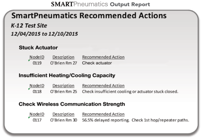 SMARTPneumatics’ patent pending analytics software performs fault detection diagnostics and produces an easy to read actionable report.