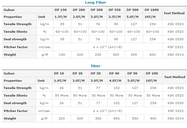 With a shape created by random arrangement of fiber or short fiber, needle punching method is used in case of short fiber. For long fiber, spun-bonding method is used to accumulate about 200~800g/m2 and bonding is done using needle punching or heat fusion. In general, fibers form random structures with excellent dynamic and mathematical characteristics. Polypropylene and polyester fibers are minly used, and nonwoven fabric performs functions like separation, reinforcement, protection, filter and drainage.