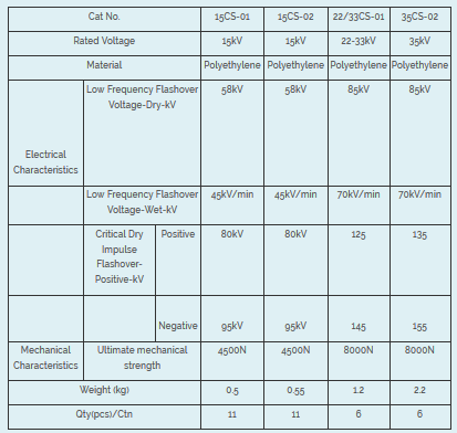The HDPE cable spacer shall be made of track-resistant high-density polyethylene which suitable for using in the tropical climatic area and have passed electrical and mechanical test according to ANSI C29 standards. Each cable spacer shall be furnished with cable ties for securing cables. The snap ties shall be made of UV resistant polyurethane material which suitable for using in the tropical climatic area.