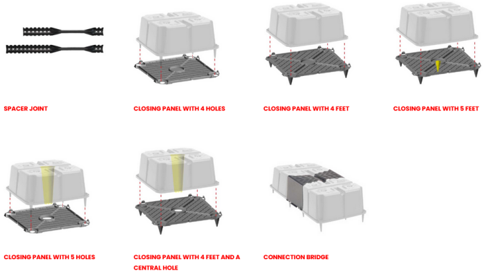 Thanks to the conic elevator foot, immerging the U-Boot® Beton formworks in the concrete casting will create a gridwork of mutually perpendicular beams closed from the bottom and the top by a flat plate that is created with a single casting; this results in considerable reduction in the use of concrete and steel.