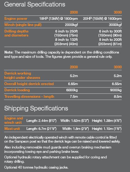 Complete mobile drilling rig for operating percussion drilling tools and casing, sampling and testing equipment. Suitable for towing behind Landrover or light truck. The MK2 features a new clutch, giving improved snatch capability to the rig.