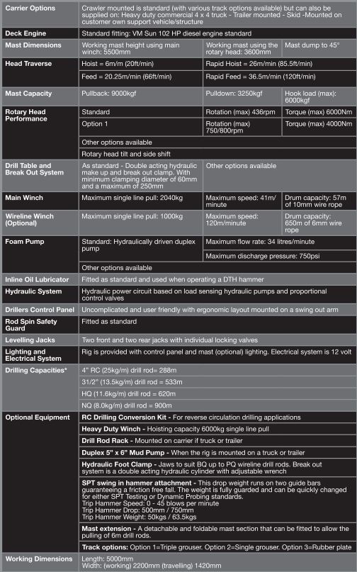 A high performance, multipurpose drilling rig with 9000kgf pullback, ideal for water, mineral exploration,geotechnical investigation, core drilling and GSHP drilling applications. The track mounted machine`s compact and lightweight design allows it to operate in tight spaces with limited access.