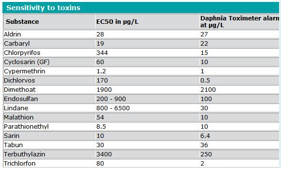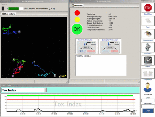 The concept of the toxicity index is based on the evaluation of certain measurands, such as speed or height, and changes in these measurands. Only when 2 or more of the measurands simultaneously show unusual results within a fixed period of time does the DaphTox II trigger an alarm.