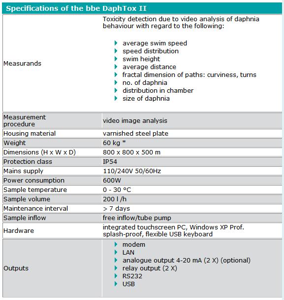 Sample water (0.5 - 2 l/h) continuously runs through the measuring chamber containing the daphnia. The live images obtained using a CCD-camera are evaluated online with an integrated PC to analyse changes in the behaviour of the daphnia. If the change is statistically significant, an alarm is triggered. The method of image analysis enables a series of measurement methods and plausability tests to assess the daphnia`s behaviour using different criteria.