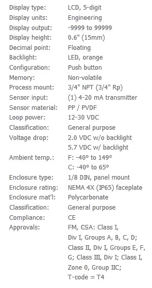 FM and CSA approved intrinsically safe, the loop powered level indicator displays engineering units connected in series with one 4-20 mA continuous level transmitter. Select the LI25-2001 level indicator for hazardous applications with an intrinsically safe sensor. For field mount installation, add a single or two indicator NEMA box.