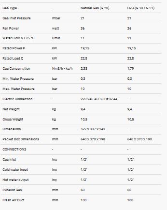 Because of providing constant water temperature no need to lukewarm. No hot water problem with 11 liter capacity in winter. Water temperature stays constant at the low water level. Because of small dimensions, living quarters improve. Operates with NG and LPG. Because of hermetic it does not use air of place where it places. Have widespread service stations in Turkey. High Efiiciency.