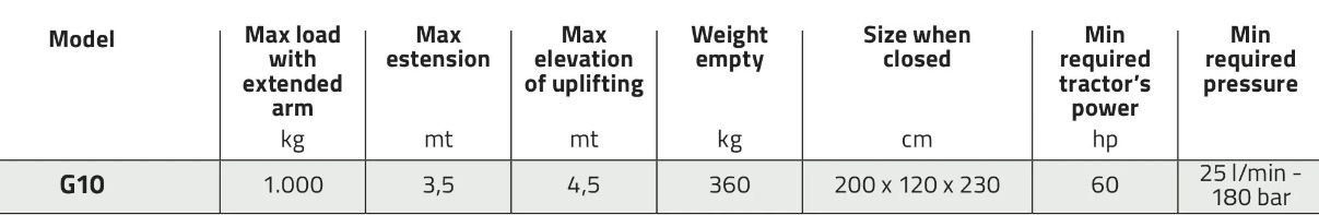G10 model is designed to lift 600 kg or more fertilizer bags in an easy way and it can be applied to any tractor with a 3-point linkage 2° category. Made of high quality steel, it can be connected to any fertilizer spreader with a maximum capacity of 2500 lt. The lifting arm is controlled by an hydraulic distributor from the tractor cab (2 double-acting hydraulic connections are required) and it can lift up to 1000 kg maximum. Its maneuverability and speed of movement is very useful for various lifting jobs within the farm.